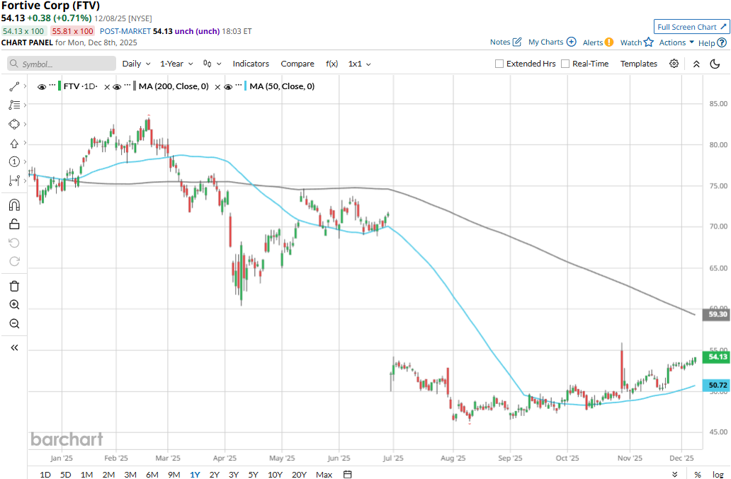 FTV stock has traded consistently below its 200-day moving average since March and climbed above its 50-day moving average since late September, underscoring its previous bearish movement and recent upturn.